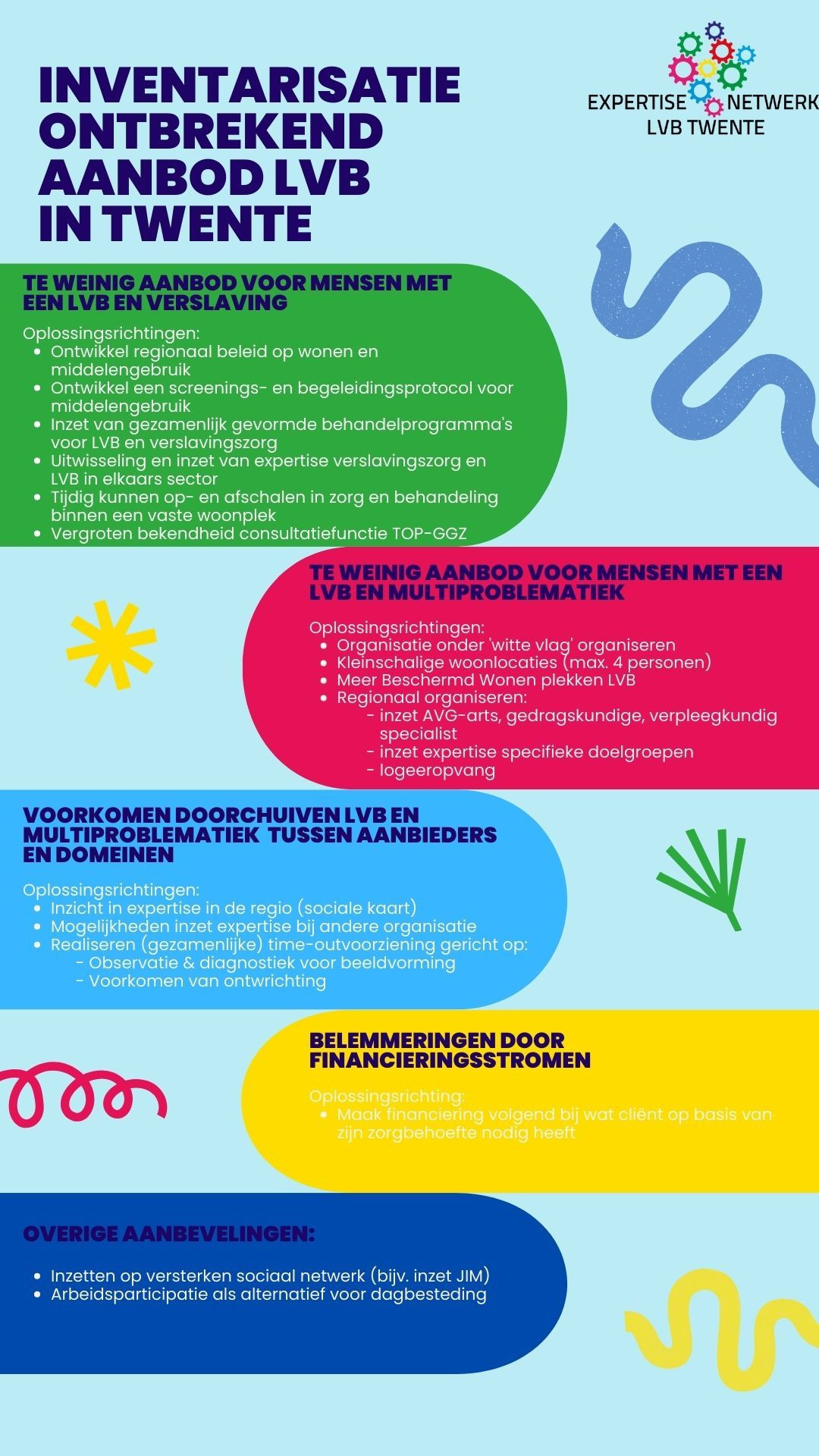 Het was een belangrijke mijlpaal waar we trots op zijn. Deze inventarisatie is het resultaat van een enthousiaste en intensieve samenwerking met een groot aantal netwerkleden. Samen hebben we de tekorten in het zorgaanbod voor mensen met een LVB in Twente in kaart gebracht. We hebben niet alleen de knelpunten benoemd, maar ook concrete oplossingen aangedragen die echt kunnen bijdragen aan een beter zorgaanbod dat beter aansluit bij de behoeften van mensen met een LVB in de regio Twente.